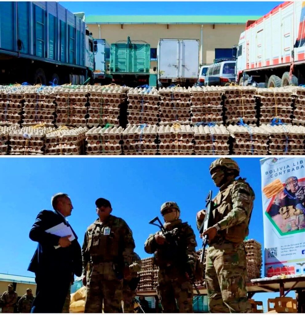 Autoridades incautaron 96 mil maples de huevos, 4 mil litros de diésel, 60 garrafas de gas, 74 celulares, además de quintales de azúcar y carne de pollo en las fronteras de Desaguadero, Guaqui, Tiquina y la frontera con Chile.